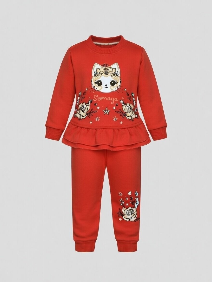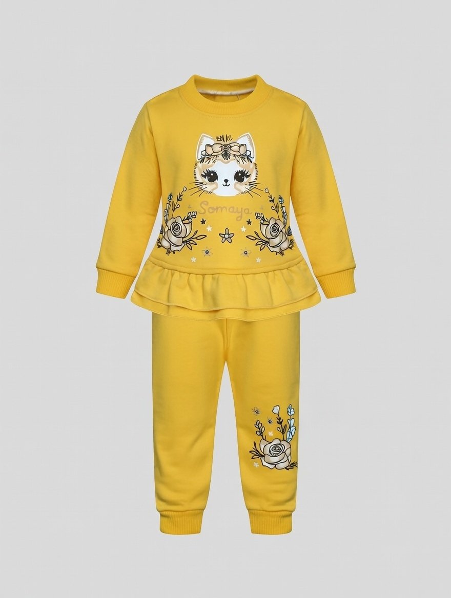 This adorable baby girl winter fleece suit is thoughtfully designed to provide warmth, comfort, and everyday style during colder days. The soft fleece top features a charming kitty face print with delicate floral accents and a cute frill hem that adds a playful touch. Paired with matching cozy trousers, this set offers a relaxed fit that allows easy movement for playtime and daily activities.