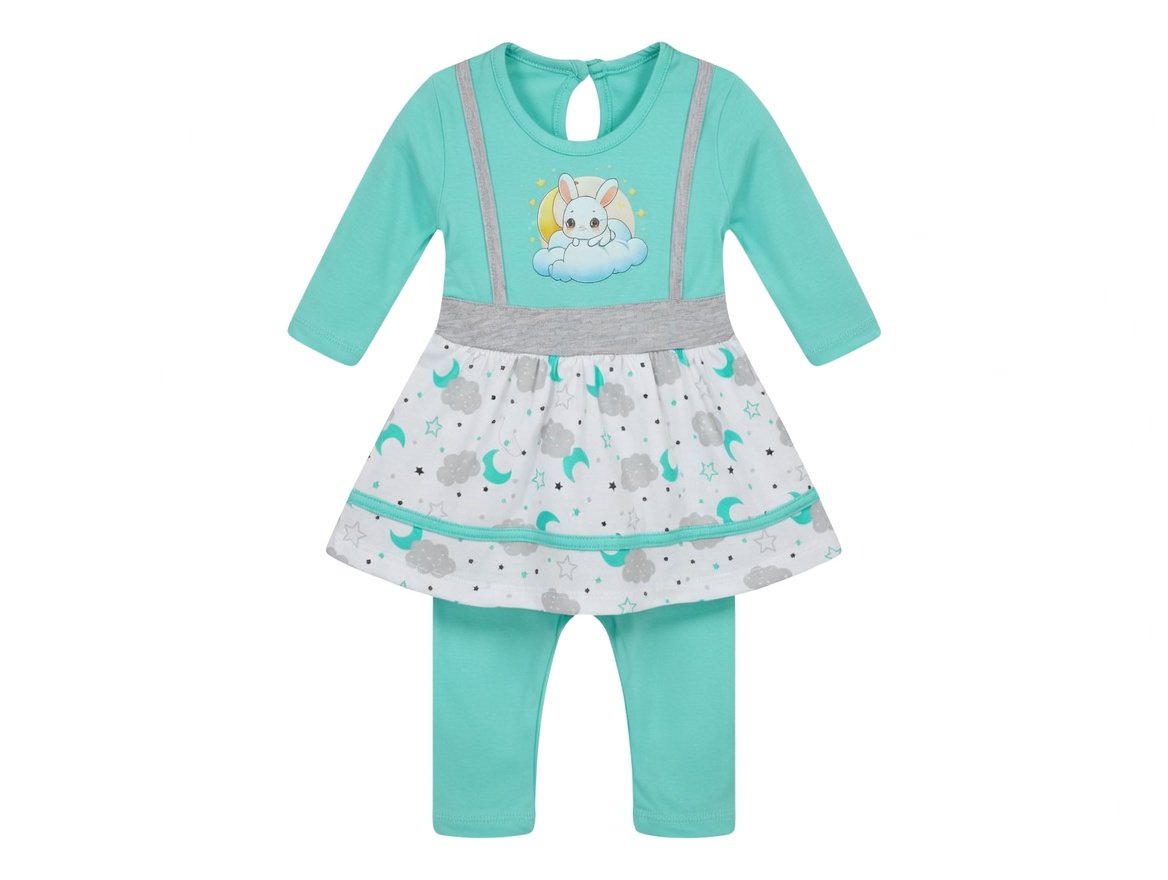 Adorable toddler Eid outfit featuring a bunny cloud design with moons and stars. Perfect for Eid prayers, family gatherings, and festive photos. Soft, breathable fabric ensures comfort while vibrant colors add festive charm.